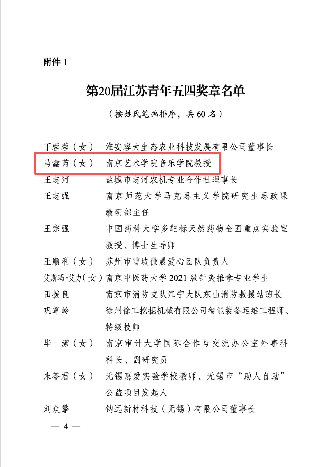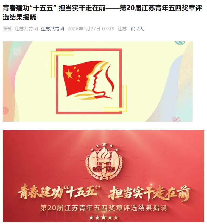 近日,由共青团江苏省委、江苏省人力资源和社会保障厅联合开展的第20届“江苏青年五四奖章”评选结果正式揭晓,我院马鑫芮老师成功获评,斩获这项江苏省青年最高荣誉!