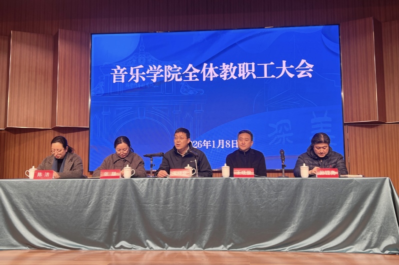 2026年1月8日上午,音乐学院召开全体教职工大会,全面总结2025年工作,布置学期末和寒假工作。2025年,音乐学院坚持以习近平新时代中国特色社会主义思想为指导,深化党的创新理论武装,扎实开展深入贯彻中央八项规定精神学习教育,坚持全面从严治党,落实立德树人根本任务,在政治建设、作风建设、队伍建设、教育教学、科研艺创等各方面取得新成绩。深入学习贯彻党的二十届四中全会、习近平总书记在抗战胜利80周年纪念大会上的重要讲话精神,以巡视巡察整改为推动,不断提高政治站位,加强政治能力建设。全年举行党委理论学习中心组集体学习16次,党委会会议29次,党政联席会议40次,全院教职工集体学习6次。践行习近平文
